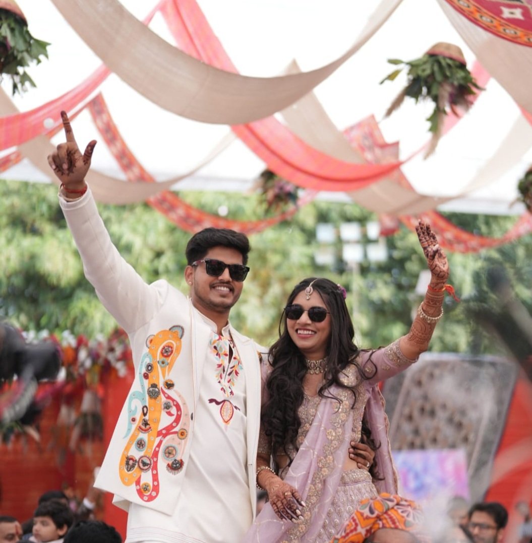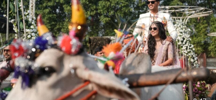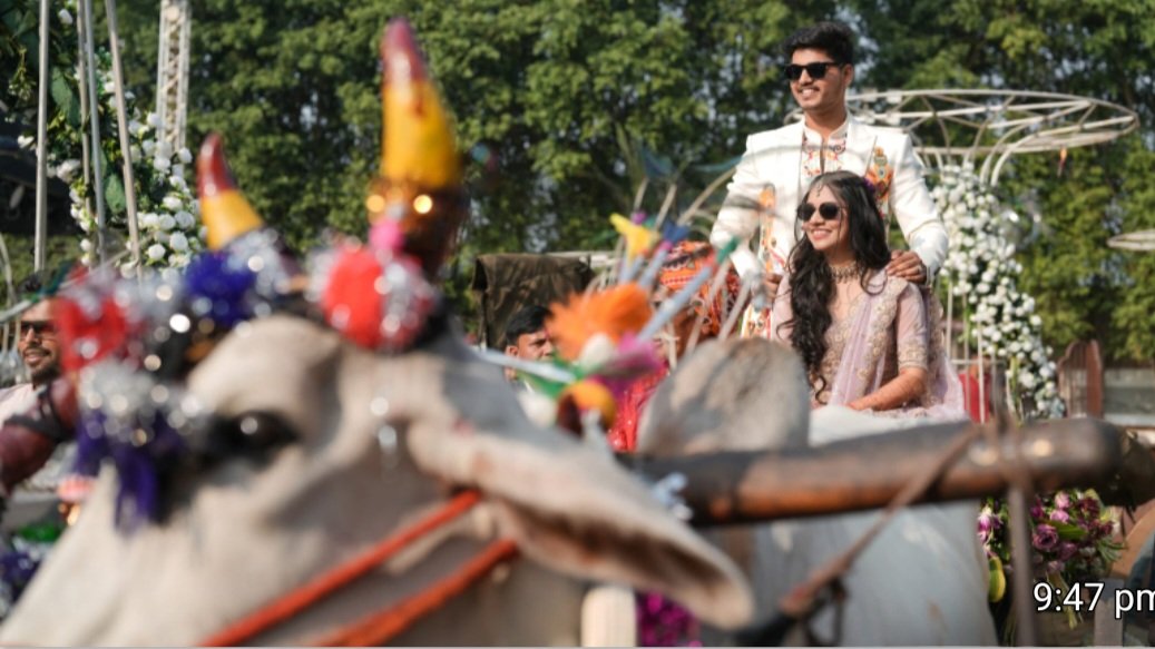 मुख्यमंत्री डॉ. मोहन यादव के छोटे बेटे डॉ. अभिमन्यू यादव और दुल्हन डॉ. इशिता के साथ शनिवार को बैलगाड़ी पर सवार होकर विवाह स्थल पहुंचे। चिंतामण गणेश मार्ग स्थित होटल अधर्व के पीछे मैदान में कॉर्निवाल कार्यक्रम रखा गया। इसमें दूल्हा-दुल्हन चश्मा लगाए बैलगाड़ी पर दिखाई दिए। दूल्हा बैलगाड़ी को आगे बढ़ाने की मुद्रा में तो दुल्हन उनके सामने बैलगाड़ी पर बैठी थी।