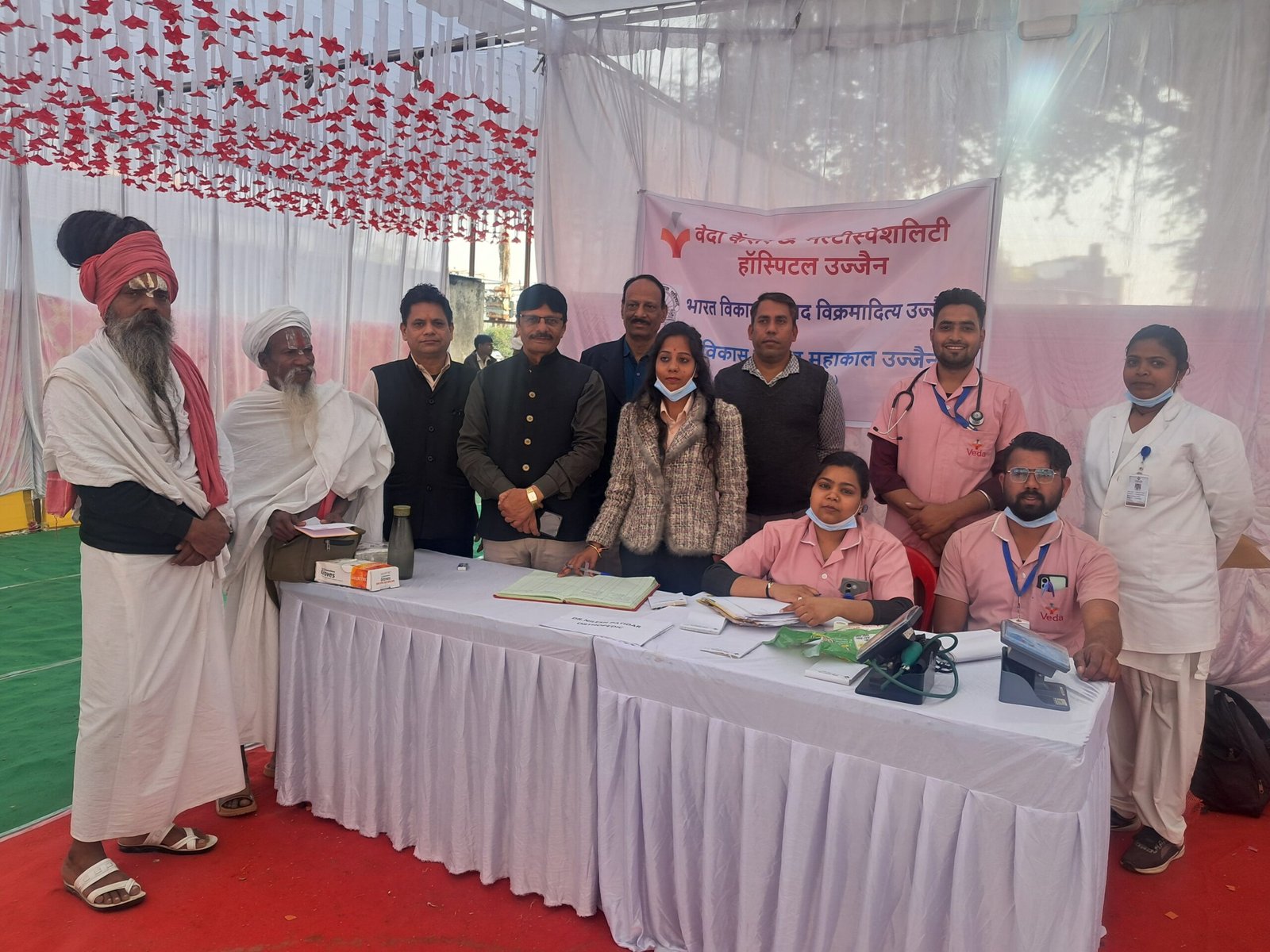 उज्जैन भगवान् श्री महाकालेश्वर महाराज एवं गुरुजनों के आशीर्वाद से 108 फीट श्री अर्द्धनारेश्वर शिवशक्ति प्रतिमा एवं अयोध्या धाम मंदिर के प्रतिरुप श्री राम मंदिर एवं श्री शिवशक्ति हरियाणा सेवा आश्रम का भूमि पूजन दिनांक 22 जनवरी गुरुवार भूमि पूजन स्वामी श्री कृष्णागिरी जी महाराज शांति स्वरूपानंद जी महाराज चार धाम मंदिर श्रीपंच दशनाम आह्वान अखाड़े के राष्ट्रीय महामंत्री श्री महंत सत्य गिरी जी महाराज महामंडलेश्वर वैराग्यानंद जी गिरी के सानिध्य में संपन्न हुआ तत्पश्चात के तिरुपति धाम मंदिर के पास, बड़नगर, रोड़, उज्जैन पर आयोजित कार्यक्रम में अनुसुइया माता, अत्रिऋषि एवं दत्तात्रय भगवान की कुटिया का अनावरण एवं निःशुल्क अन्नपूर्णा रसोई का भूमि पूजन भी साथ मे संपन्न हुआ इस भव्य समारोह में तेराह अखाड़े के संत महंत एवं भक्तजन, शिष्यगण एवं सेवकगण आदि को भंडारा प्रसादी ग्रहण करवाई गई स्थानीय बड़नगर रोड स्थित आश्रम में भारत विकास परिषद विक्रमादित्य एवं महाकाल के संयुक्त तत्वावधान में आयोजित 74वें स्वास्थ्य शिविर में 450 का निःशुल्क परीक्षण कर दवाइयां भी दी गई। महामंडलेश्वर वैराग्यानंद जी गिरी एवं कृष्ण गिरी जी महाराज के पावन सानिध्य एवं वेदा हॉस्पिटल डॉयरेक्टर डॉ. समन्वय गोकुलदास के मुख्य आतिथ्य में आयोजित कार्यक्रम की अध्यक्षता संस्था संरक्षक भगवान शर्मा ने की। अतिथि दीपक राजवानी थे। वेदा हॉस्पिटल के सह्योग से आयोजित इस शिविर के संयोजक सुभाष पाठक, अजय जोशी कुंडवाला एवं मैनेजर दीपेश शर्मा ने बताया कि संस्था सचिव डॉ. विशाल पाटीदार सहित डॉ. सोनू पाटीदार यूरोलॉजिस्ट, डॉ. नीलेश पाटीदार आर्थोपेडिक, डॉ. विकास भालेकर कैंसर रोग विशेषज्ञ, डॉ. दिनकर सप्रे एम डी मेडिसिन, डॉ. अनिल दुबे एम.डी. मेडिसिन, डॉ. सुनील नागर आरएमओ, डॉ.आभा जैन डाइटीशियन, बग्गा सुपर आई हॉस्पिटल की डॉ.अर्चिता सिंह बग्गा नेत्र विशेषज्ञ, श्रेयांश सिजेरिया प्रबंधक, देवयानी सिंधल, विनीता परमार, (कर्नल) जी. व्यास, डॉ. रूपेश खत्री, डॉ. जितेंद्र शर्मा, डॉ. राहुल नागर, डॉ. अजय मंडलोई, डॉ. सी.पी. पाटीदार, डॉ. सुनील शर्मा, डॉ. मुस्तफा सिंगापुरवाला, डॉ. स्वप्निल पेंडारकर, डॉ. सुरेश समदानी, डॉ. रजनीश पाटीदार, डॉ. विजय पाटीदार, डॉ. विशाल पाटीदार, डॉ.आशीष दुबे, डॉ. सुरेश बैंडवाल, डॉ. योगेश सर्राफ, डॉ. शरद गोवा, डॉ. सोनू पाटीदार, डॉ. उमेश शुक्ला, डॉ. हुसैन फ्रीगंजवाला, डॉ. साधना दुबे, डॉ. दीपक फूलवानी, डॉ. समर्थ पाटीदार, डॉ. विजय पाटील, डॉ. पदमसिंह नरवरिया, डॉ. बी. के. मालवीय, डॉ. गिरधर सोनी, डॉ. अमृता सोनी, डॉ. आदित्यवर्धन पाटीदार, डॉ. आनंद यादव, डॉ. सिद्धार्थ मारोठिया एवं डॉ. आभास शर्मा के द्वारा सभी मरीजों के परीक्षण के साथ आवश्यक मार्गदर्शन भी दिया गया
