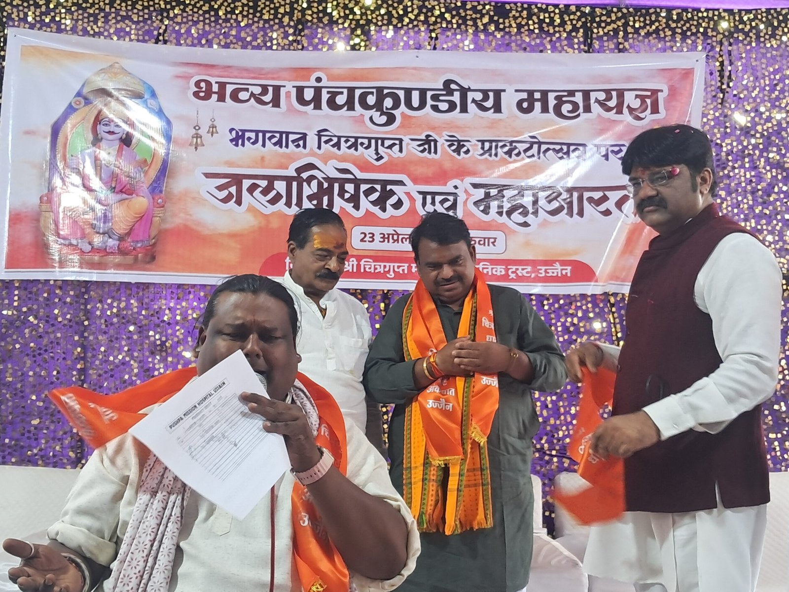 उज्जैन | चित्रगुप्त मंदिर सार्वजनिक न्यास ट्रस्ट के तत्वावधान में गंगा सप्तमी पर गुरुवार को अंकपात स्थित चित्रगुप्त धाम में भगवान चित्रगुप्त का प्रकटोत्सव मनाया गया। सुबह वैदिक मंत्रोच्चार के बीच पांच पवित्र नदियों के जल से जलाभिषेक किया गया इसके बाद नए वस्त्र अर्पित कर कायस्थ परिवारों द्वारा घर में तैयार किए गए नैवेद्य का भोग लगाया कार्यक्रम के मुख्य आकर्षण पंचकुंडी महायज्ञ में 101 जोड़े का वैदि विधि-विधा के साथ संपन्न हुआ महायज्ञ में भाग लेने वाले जोड़ों के लिए लाल साड़ी तथा पीले या सफेद कुर्ते जैसे पारंपरिक परिधान में निःशुल्क बैठकर पूजा की व्यवस्था की गई थी। अध्यक्ष एवं अखिल भारतीय महासभा के राष्ट्रीय मंत्री अमित श्रीवास्तव ने जानकारी देते हुए कहा बच्चों और युवाओं को प्रोत्साहित करने के लिए रंगोली और चित्रकला प्रतियोगिता भी रखी गई चित्रकला प्रतियोगिता 10 से 25 वर्ष आयु वर्ग के लिए थी और प्रतिभागीयो को भगबान चित्रगुप्त का चित्र भेंट किया गया श्रेष्ठ प्रदर्शन करने वालों को प्रथम, द्वितीय और तृतीय पुरस्कार दिये महायज्ञ सुबह 9 से प्रारंभ होकर दोपहर 12 बजे तक इसके बाद महाआरती और भोजन प्रसादो का आयोजन किया गया इस कार्यक्रम में प्रमुख रूप से अतिथि महापौर मुकेश टटवाल गणेश गौड़, भरत सक्सेना, चेतना श्रीवास्तव सहित समाजजन मौजूद थे।